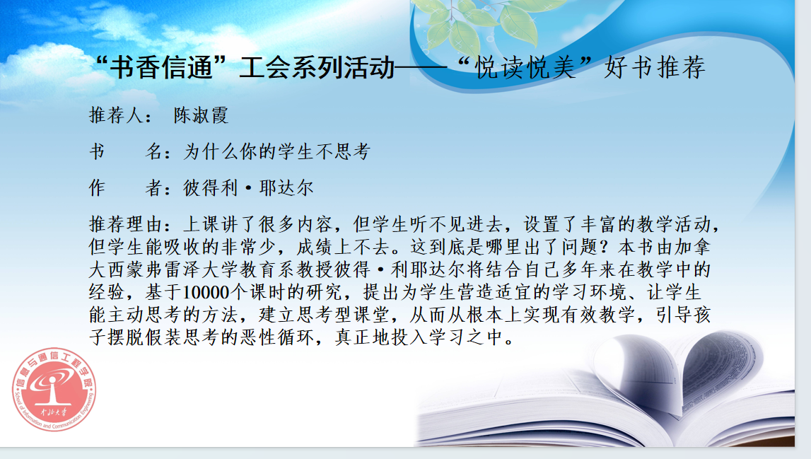 “书香信通”读书系列活动,包括“悦读悦美”好书推荐和“悦读悦美”读书沙龙。在沙龙中各位教师来到现场一同分享喜爱的书籍。现场,大家积极分享,气氛热烈。在读书交流中,大家依次分享了自己喜爱的书籍,与经典同行,为生命阅读。他们或充满激情、或娓娓道来,结合各自的工作生活经历和切身体会,畅谈自己的感悟,并与在场人员交流分享阅读心得,在分享中汲取精神力量,弘扬红色传统、传承红色基因。