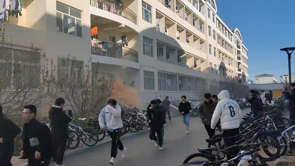 下午14时05分,消防应急疏散逃生演练正式开始,模拟“火情”出现,班级安全员发现火情,第一时间向总调度报告,急促的防空警铃响起,参演辅导员及员工骨干、班级安全员按照演习预案,引导员工有序撤离到应急避难场所,等待救援力量赶往现场。从发现“火情”到全部同学安全撤离到应急避难场所,整个过程用时2分50秒。