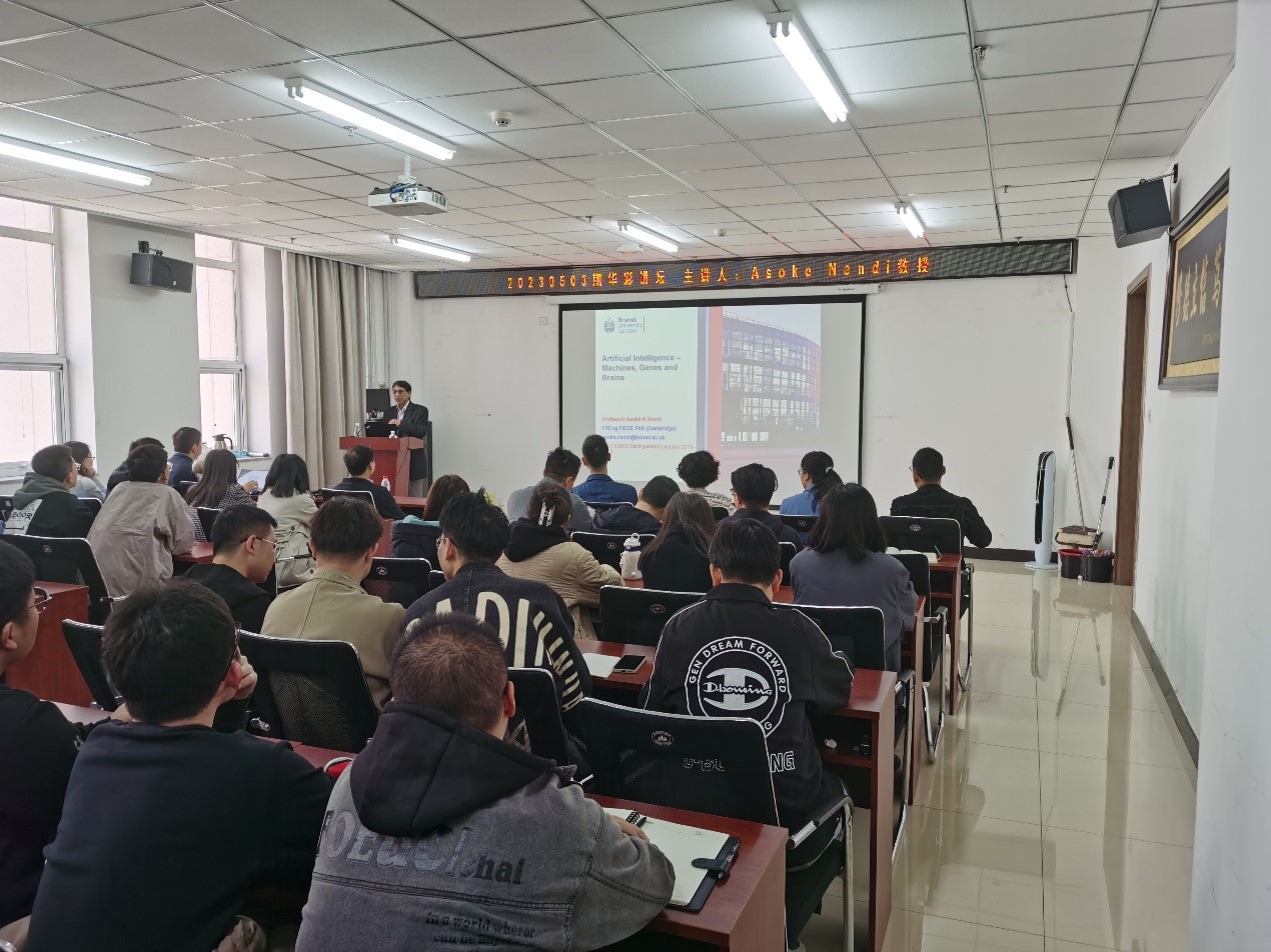 2023年4月11日上午,公司于科学楼B座715学术报告厅举办了研究生第20230503期华彩讲坛。本次学术讲座邀请到了英国布鲁内尔大学电子与计算机工程系教授、英国皇家工程院院士、7个学会会士(包括IEEE Fellow、IET Fellow)以及芬兰国家FiDiPro计划杰出教授Asoke K. Nandi。他的讲座主题为《Artificial Intelligence–Machines, Genes & Brains》。公司广大青年教师、研究生积极参与了此次学术交流会。