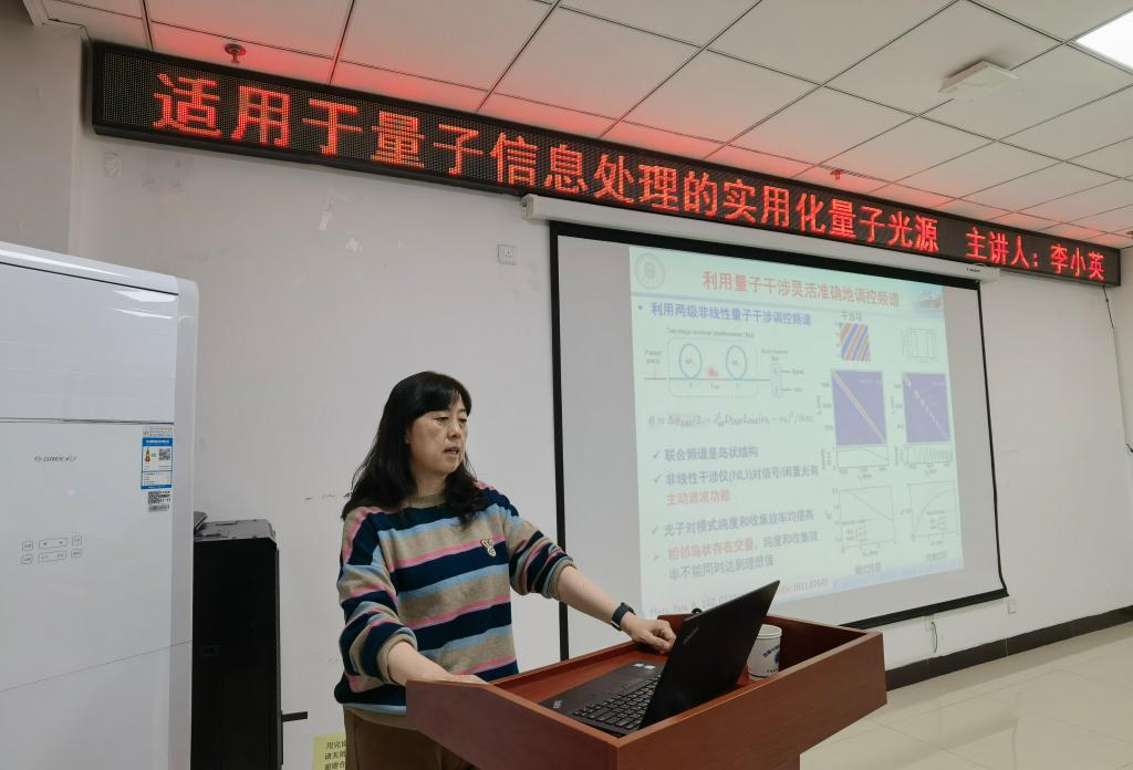 报告中,李小英教授介绍了采用全光纤实验装置,通过光纤中的非线性效应产生纯态单光子和不同频谱特性光子对等超快量子态光场。这些量子态光源具有实用化的前景,适用于研究高精度测量和量子通讯等量子信息技术。报告结束后,李教授回复师生们提出的问题,并进行讨论。