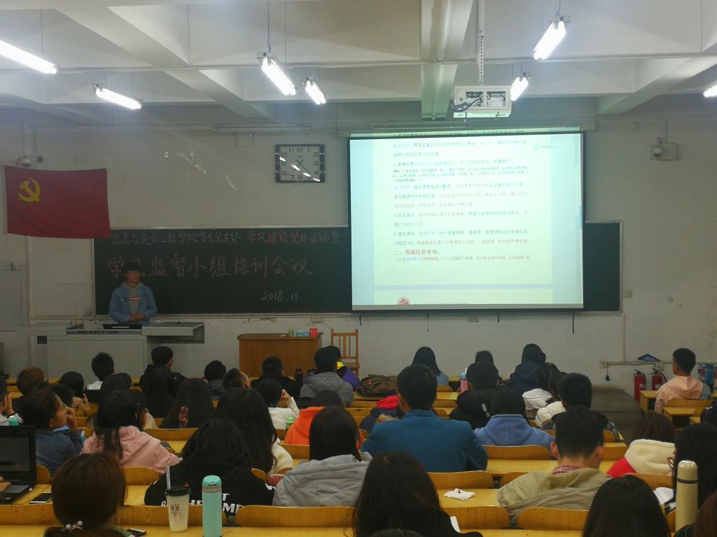 电子信息工程专业员工党支部副书记卢宏伟同学首先就《党员成长手册》以及朋辈学业辅导的内容进行了讲解,提出了每一位党员都应该以身作则,用自己所学的知识去帮助身边的同学。朋辈辅导工作以三个同学为一个学习小组,固定辅导一组课题内容,每周定时给低年级同学进行学业辅导。光电信息科学与工程专业员工党支部副书记余成臻同学对学风监督工作的具体要求进行了讲解,对查课过程中遇到的问题进行了逐一解答。