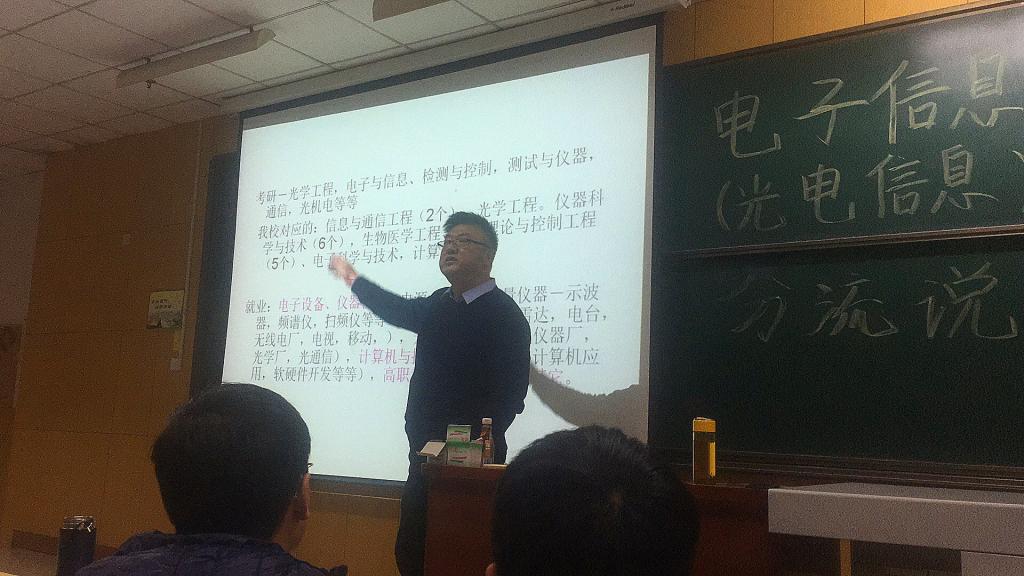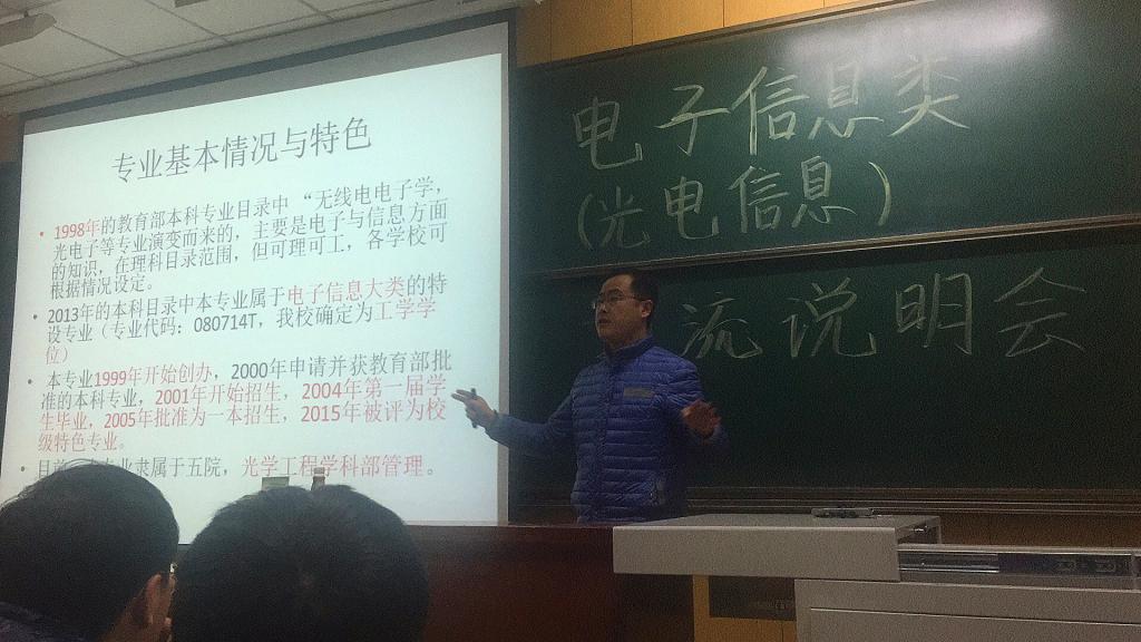 2018年11月13日下午四时在11109H召开了9428cn太阳集团古天乐2017级电子信息类光电信息方向专业分流说明会。本次说明会邀请到公司光学工程学科管理部主任程耀瑜教授、副主任张志伟教授、专业老师王高教授为公司电子信息类所有17级光电信息方向的同学进行讲解。