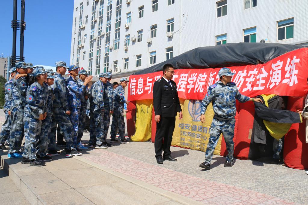 首先,贾旭海主任通过生动的案例,为大家讲解了火灾的危害以及掌握逃生知识的重要性。接下来他讲解了灭火器的正确使用方法,并请同学们亲自实操如何正确使用灭火器,最后带领大家进行模拟火场的帐篷逃生演练。