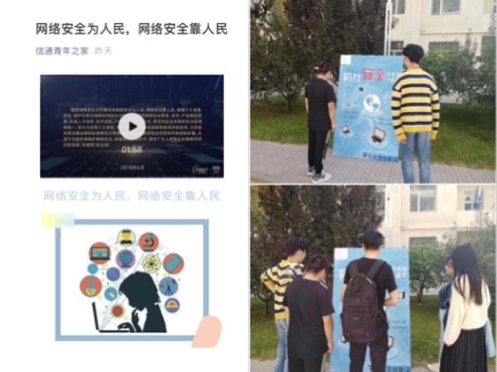 网络提供丰富的信息资源,是员工学习知识、交流思想、休闲娱乐的重要平台;可网络又存在着极大的陷阱和安全隐患。为提升员工的安全防范意识,公司院在宿舍楼下和食堂门口人流量大而集中的位置摆放网络安全宣传画板,并利用公司官方微信公众号“信通青年之家”平台发布网络安宣传视频。