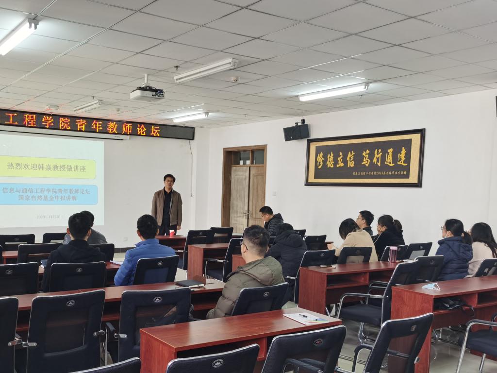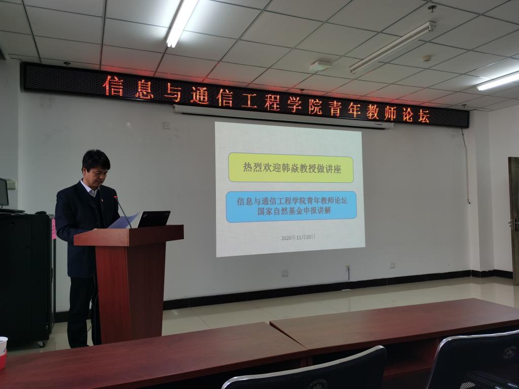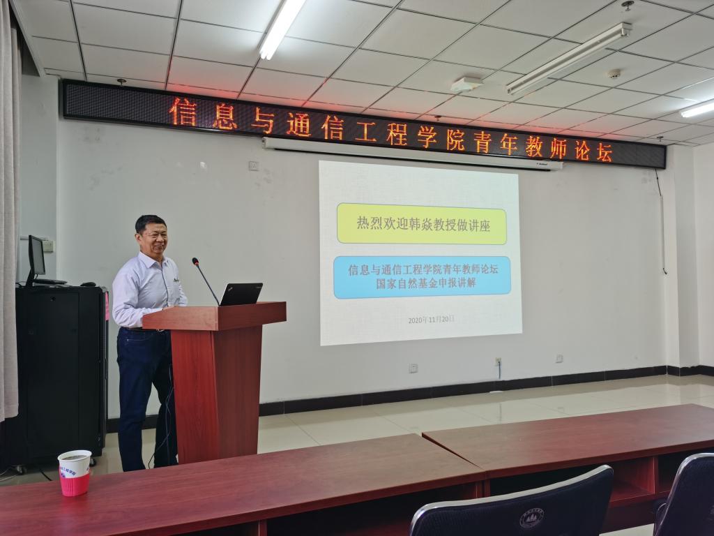 2020年11月25日,应信息通信工程公司青年教师论坛邀请,韩焱教授在公司715学术报告厅做了题为《国基金项目申请书重点关注的问题》的学术讲座。公司党委书记曹凤才、经理杨风暴、论坛秘书长和公司青年教师出席,讲座由党委书记曹凤才主持。