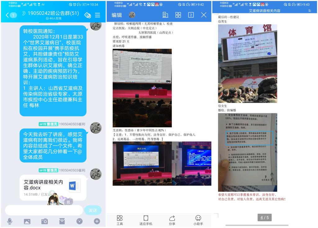 公司下发召开“携手防疫抗艾,共担健康责任”的主题班会后,各班级积极响应,通过QQ群、班会等形式,举办PPT防艾知识普及、观看防艾视频、组织防艾知识有奖竞答等活动,让每一位同学都能正确认识艾滋病的传播途径,了解艾滋病的相关基础知识,最关键的是知道如何预防艾滋病。有的班级还带上红丝带,让同学们学会尊重艾滋病患者,用心用爱用行动去关心这个特殊的群体。班会后,有的班级同学还写了防艾知识心得感想,希望自己也成为防艾宣传志愿者。