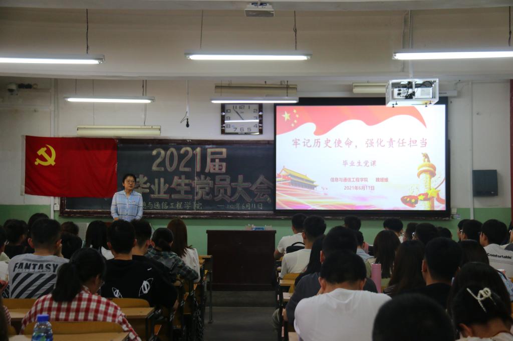 2021年6月11月,信息与通信工程公司党委副书记魏媛媛为毕业生党员上了一堂生动的专题党课——“牢记历史使命,强化责任担当”,全体毕业生党员参加了此次学习。