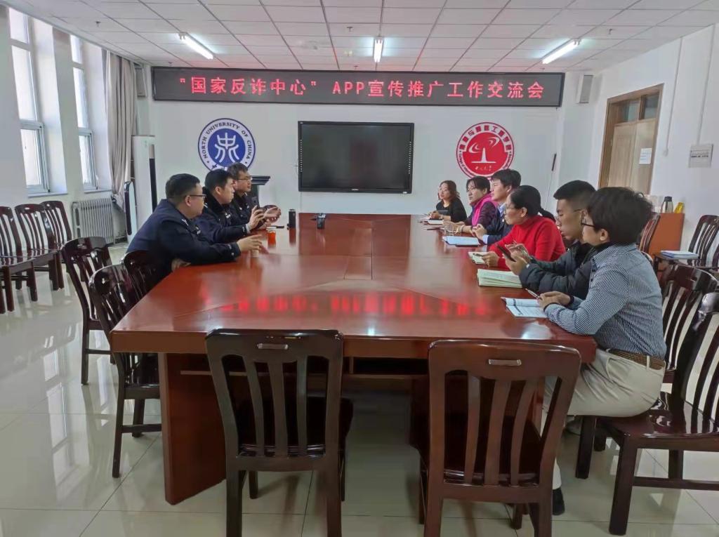 2021年11月16日,9428cn太阳集团古天乐召开“国家反诈中心”APP宣传推广工作交流会,为了切实提高广大师生的安全防范意识,真正做到防患于未然。9428cn太阳集团古天乐特邀请上兰派出所所长王伟、教导员方文义、警官王岩莅临公司进行专业化指导。信息与通信工程公司党委书记曹凤才,公司党委副书记兼副经理魏媛媛,院团委书记闫婷和员工科、科研科辅导员参加。