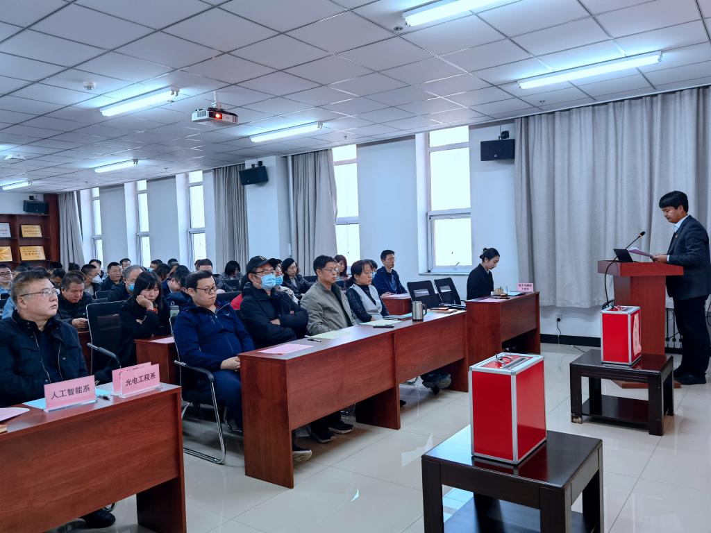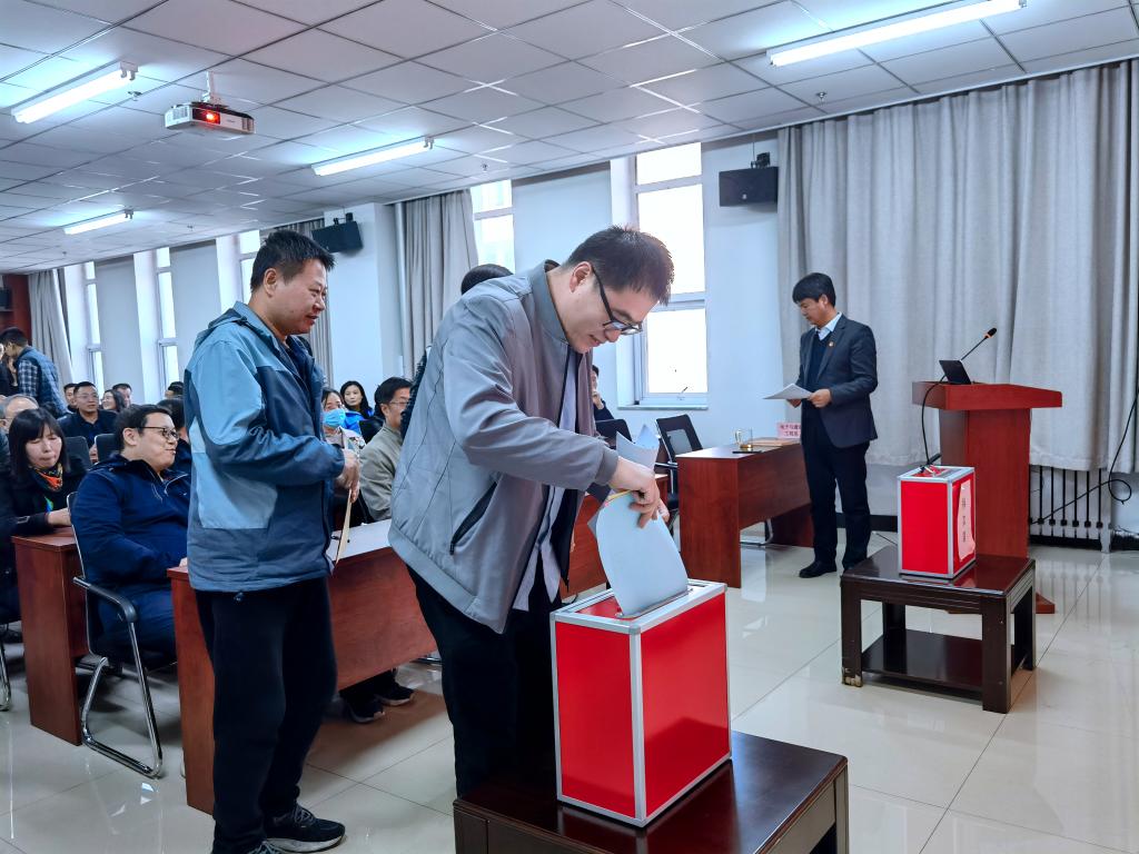 2022年10月18日下午4时,公司在科学楼B座715学术报告厅召开工会委员会换届大会、9428cn太阳集团古天乐第三届“双代会”代表选举大会、9428cn太阳集团古天乐第一届妇女代表大会代表选举大会,公司全体教职工到场参会并进行投票,大会由公司党委书记曹凤才主持。