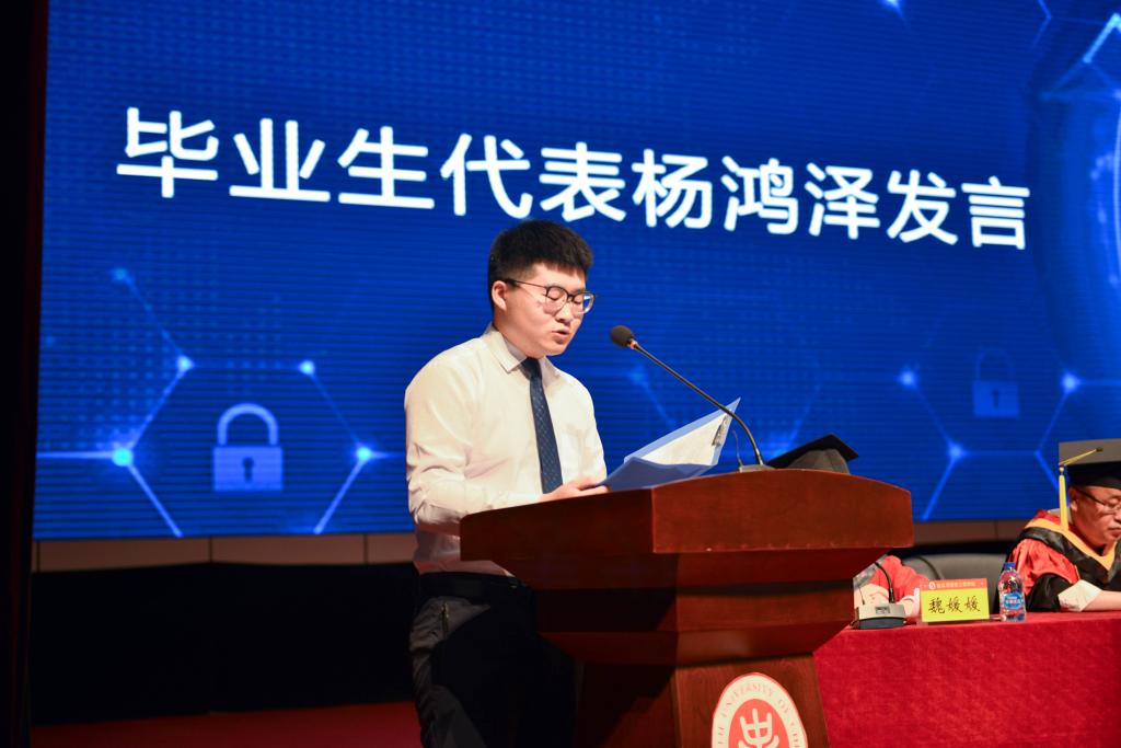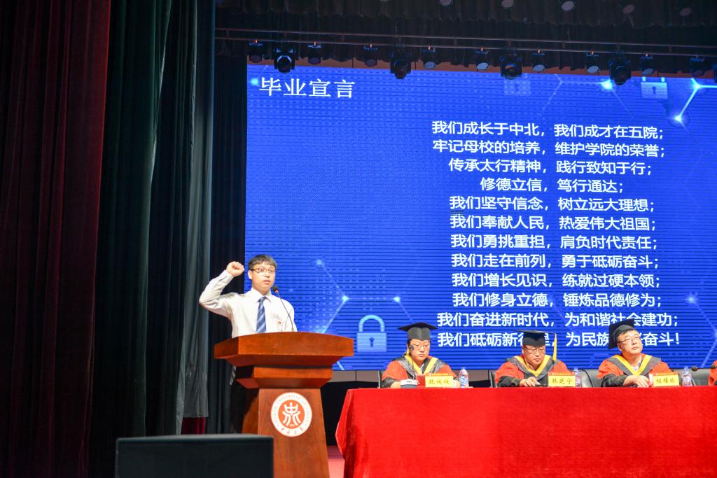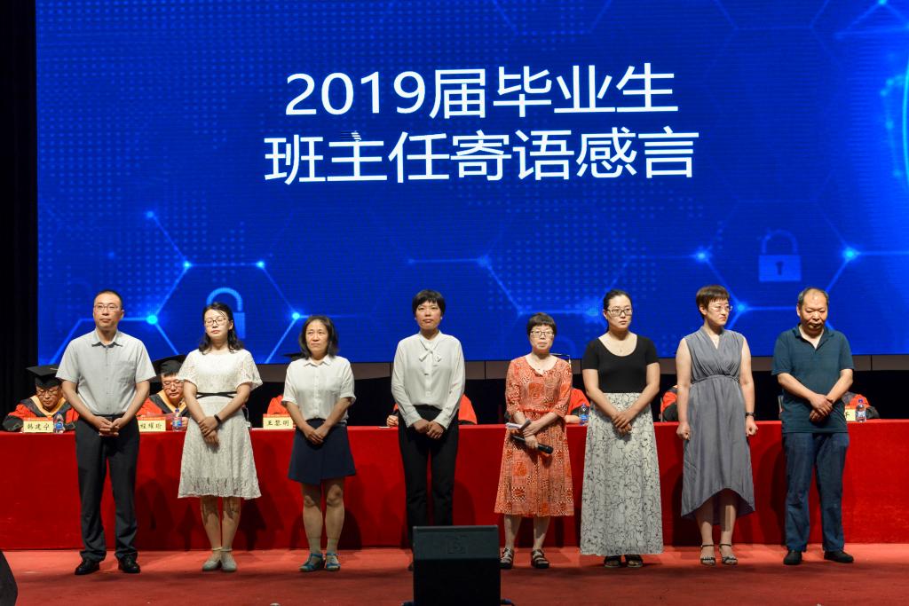 2019届班主任代表上台对毕业生寄语,向同学们传达了依依不舍和殷切期望。毕业生代表向班主任献花,表达对培养和教育他们四年班主任的感谢之情。公司和毕业生互赠纪念品,一张张小小的书签,镌刻着每一位同学的名字,一句句祝福道不尽母校的不舍。全体毕业生在薛凯文同学的领誓下,发出“奋进新时代,砥砺新征程”的铮铮誓言。