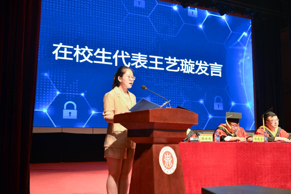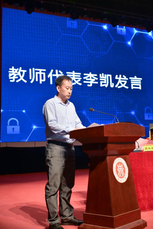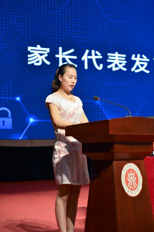 接着,董事长奖章获得者保送至复旦大学的15050442班胡朝煜同学的母亲郭瑞英女士作为家长代表发言,代表家长表达了对学校辛勤培育的感谢和对学校良好发展的祝愿。教师代表李凯希望同学们勤奋学习、积极工作,在平凡的工作岗位上建功立业。毕业生代表杨鸿泽同学深切表达了对公司领导、老师的感激之情和对同学、朋友的不舍之情,一句“再见,同学;你好,员工”,让无数同学潸然泪下。在校生代表王艺璇同学表示将继承学长、学姐们的精神,报效祖国,回报社会,同时也祝愿学长、学姐们在日后事业中鹏程万里,前程似锦。