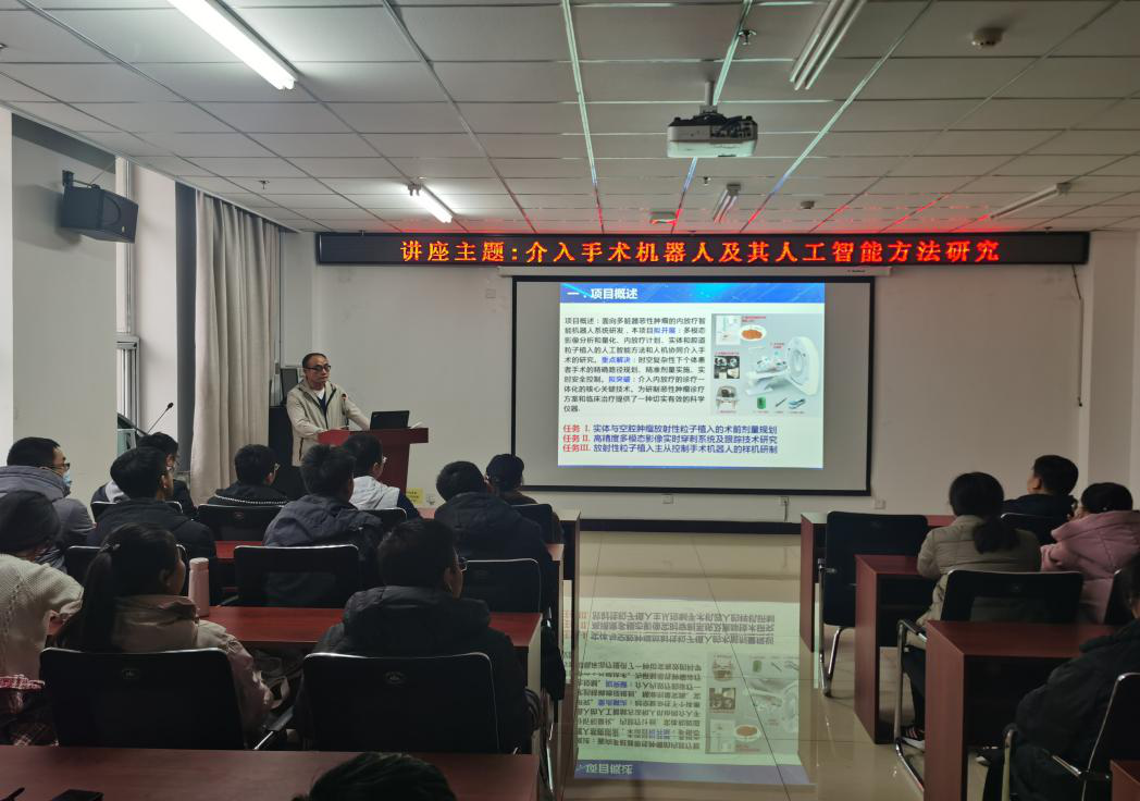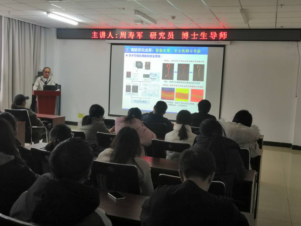 在讲座中,周老师为参会师生介绍了单位概况以及研发团队,让大家详细了解了研究项目的立项背景与意义,具体讲解了介入治疗技术,说明了机器人辅助介入治疗研究方向是未来发展趋势;随后深入浅出地讲解了自己的研究工作,包括血管介入手术机器人与穿刺放射粒子植入手术机器人等研究内容和目标、关键技术与主要创新点、课题研究成果、产学研医合作四个方面。