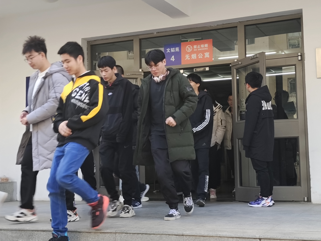 12点45分,警报铃声响起,数秒之后,宿舍楼内人员迅速跑出宿舍楼,整个过程中,同学们认真严肃对待,以最快的速度撤离出了宿舍楼,并第一时间集合到楼外空地上进行了人员清点,整个过程用时不到3分钟。