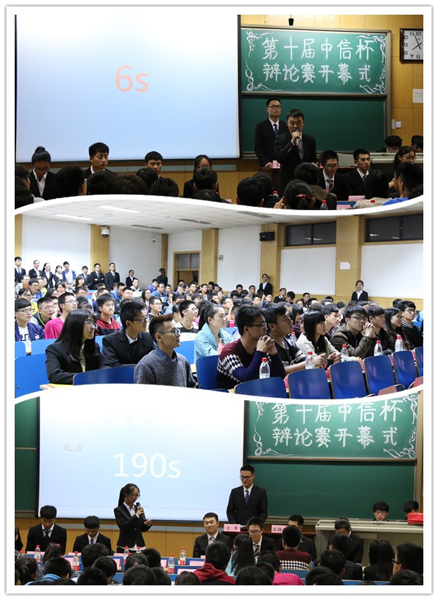 开幕式上,工作人员以视频的形式拉开了序幕,展现了公司“中信杯”辩论赛的受关注程度和比赛中的精彩瞬间。之后,由学习部部长范子天星同学宣布:“第十届‘中信杯’辩论赛正式开幕。”接着,公司八位表演赛成员为在场嘉宾和观众带来了一场精彩绝伦的辩论赛,向同学们展现了辩论赛的真正风采,展示了辩论赛活动的真谛,即唇枪舌剑拨乾坤,能人辈出站群儒。精彩的表演赛过后,观众们热烈的掌声表示了对选手们的高度评价。辩导队伍也寄予了在场观众最庄严地宣誓。在铿锵有力的宣誓结束后,15级各辩论赛参赛队伍的队长有序的上台抽签,决定了队伍在小组赛中的顺序。