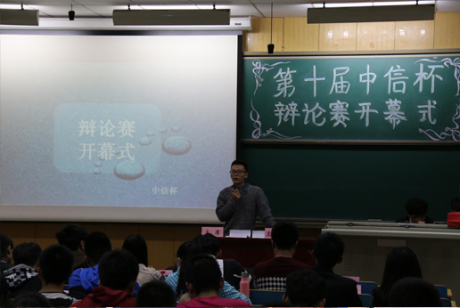 2015年10月17日晚上7点半,在主楼11409H教室由五院学习部主办的第十届“中信杯”辩论赛正式拉开帷幕了。参加此次活动的有校员工会学习部部长刘东东,软件公司主席张坚,公司员工会主席郭志浩,院团委副书记张建鑫,分科协主席吕杰芳,各主席团成员,五院辩导队伍以及15级全体参赛辩手。
