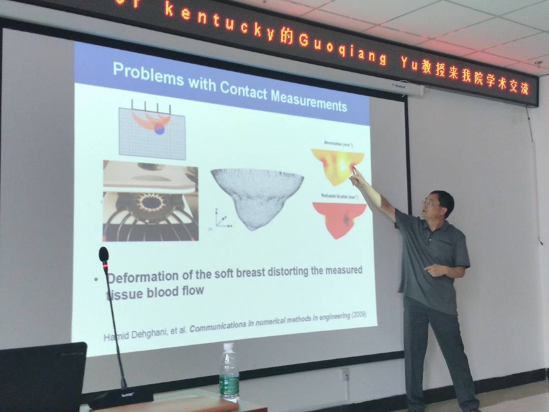 2018年7月20日上午9点,美国肯塔基大学终身教授、国际著名的生物医学工程专家Guoqiang Yu应中北老员工物医学成像与影像大数据山西省重点实验室的邀请,来公司进行了学术交流,并在公司715学术报告厅做了“非接触式近红外漫射光散斑组织血流成像技术”的学术报告。