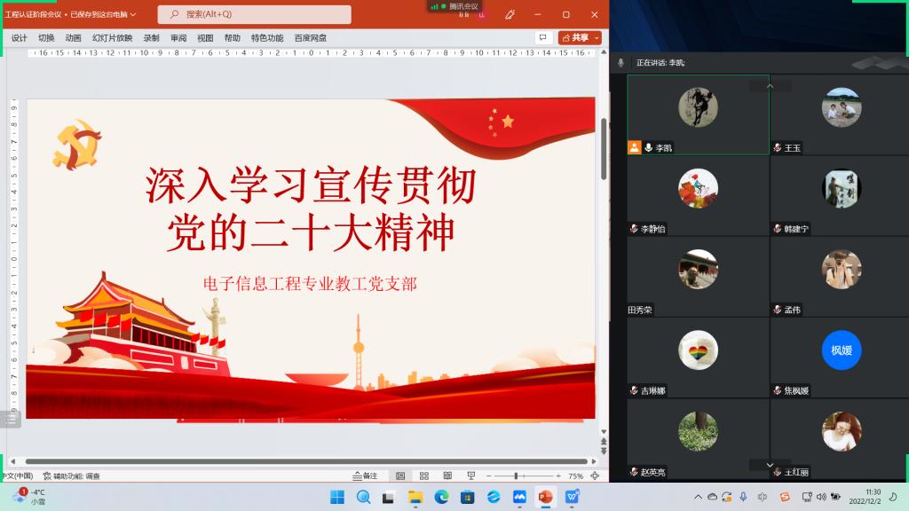 2022年12月2日,根据公司党委的安排部署,电子信息工程专业教工党支部利用腾讯会议平台召开“党的二十大精神”学习会,党支部书记李凯作了专题党课。