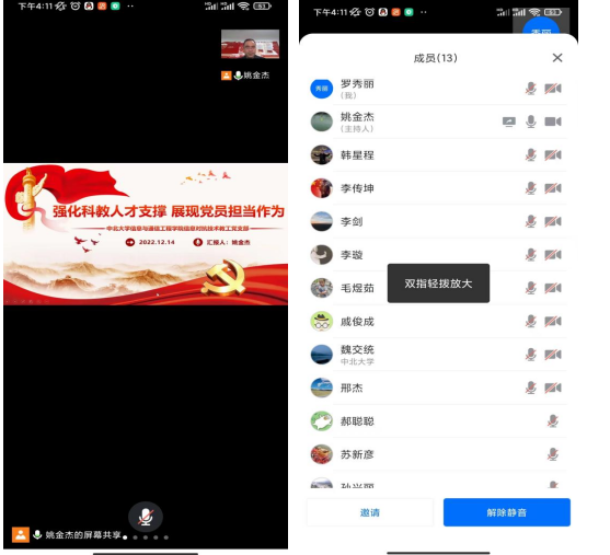 2022年12月14日,信息对抗技术教工党支部采用线上形式组织召开了党的二十大精神学习专题活动。首先,支部书记姚金杰带领大家学习了《中共中央关于认真学习宣传贯彻党的二十大精神的决定》、《全省要迅速兴起学习宣传贯彻党的二十大精神的热潮》、《山西省委理论学习中心组举行深入学习宣传贯彻党的二十大精神专题研讨会》等文件内容,