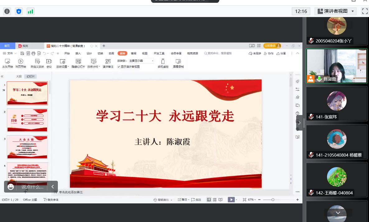 为深入学习宣传贯彻党的二十大精神,2022年12月10日晚19:00,电子信息工程员工党支部利用腾讯会议平台开展学习,党支部书记陈淑霞老师主讲了“学习二十大 永远跟党走”主题党课。