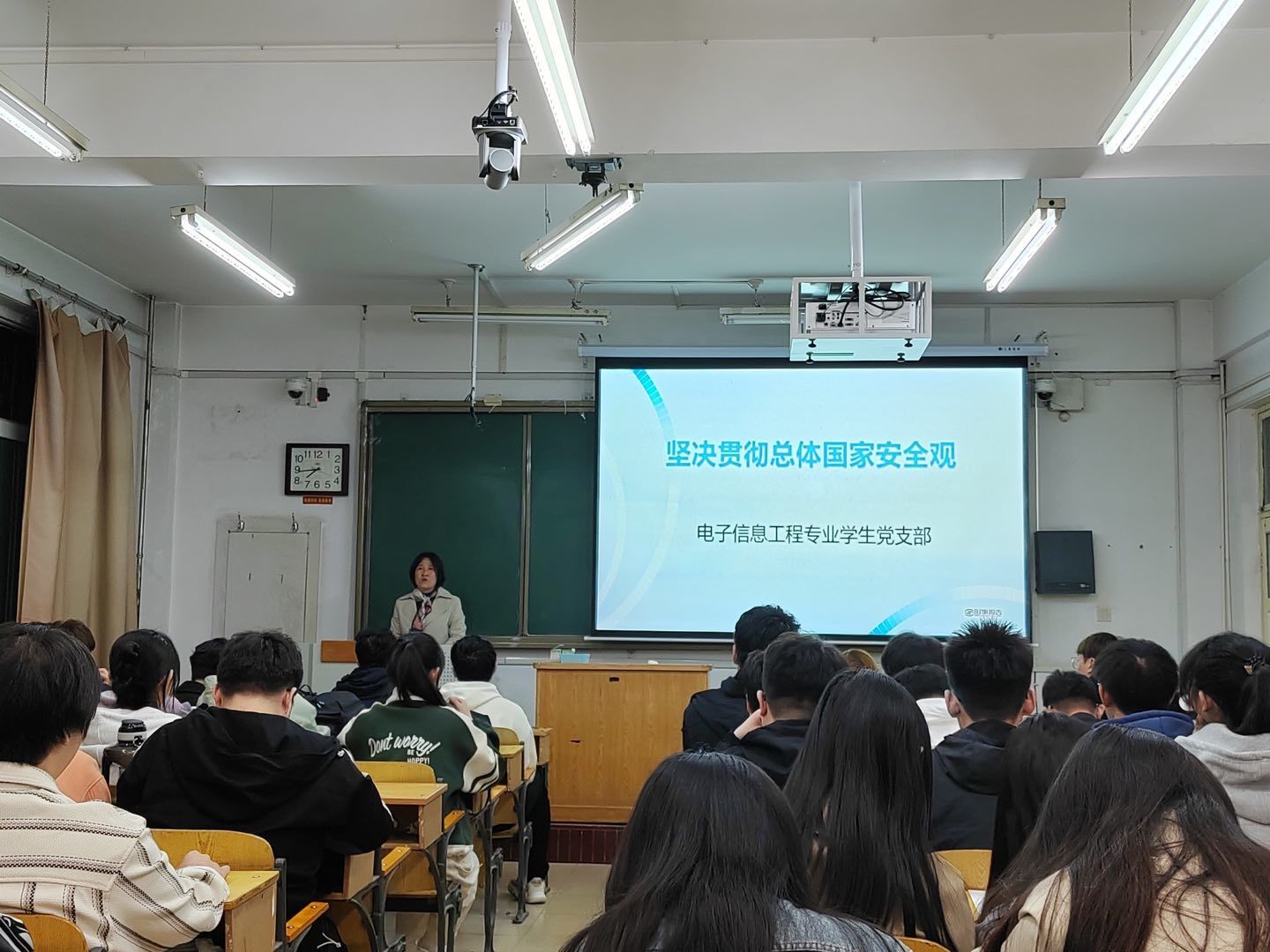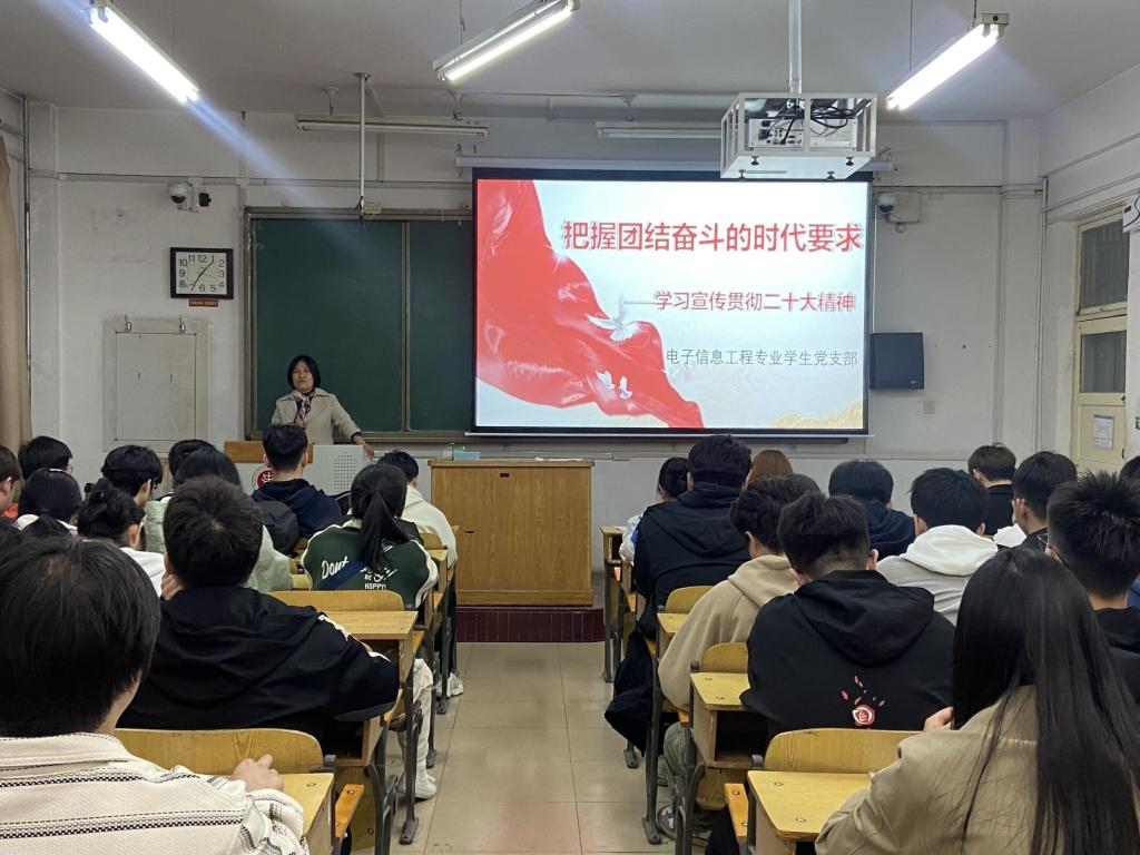 为深入学习贯彻党的二十大精神,感悟思想真谛、筑牢思想之基,2023年4月13日在10305教室,电子信息工程专业员工党支部书记陈淑霞以“把握团结奋斗的时代要求——学习宣传贯彻二十大精神”为题讲授专题党课,全体党员参加了学习。