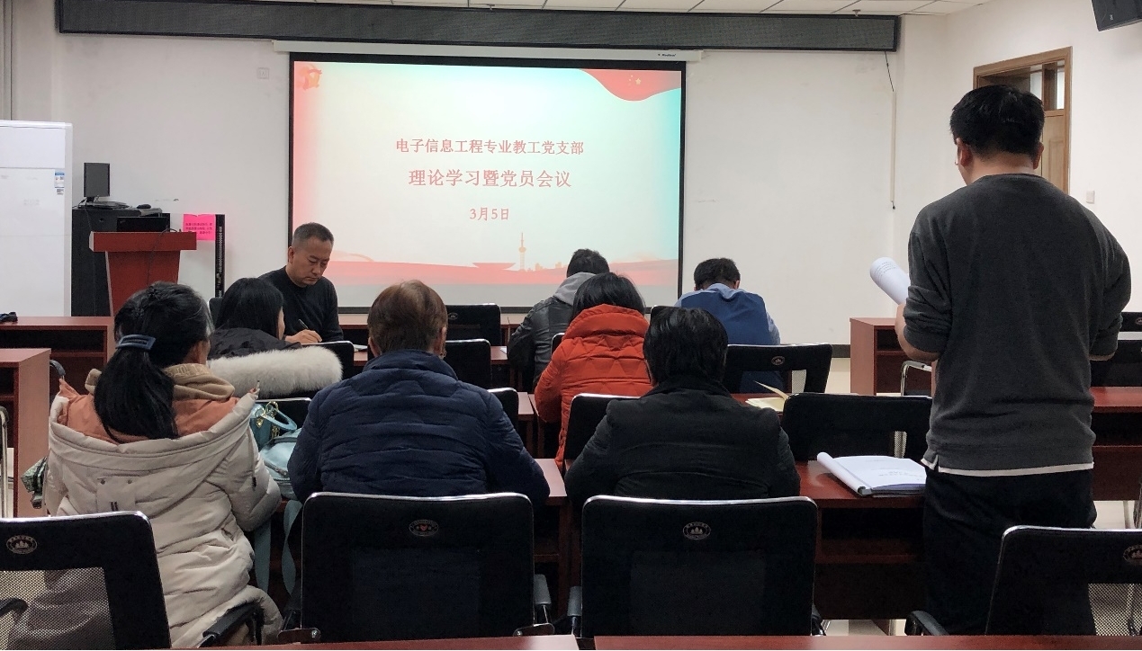 为进一步学习贯彻习近平新时代中国特色社会主义思想,3月5日,电子信息工程专业教工党支部在科学楼B座715会议室开展理论学习。