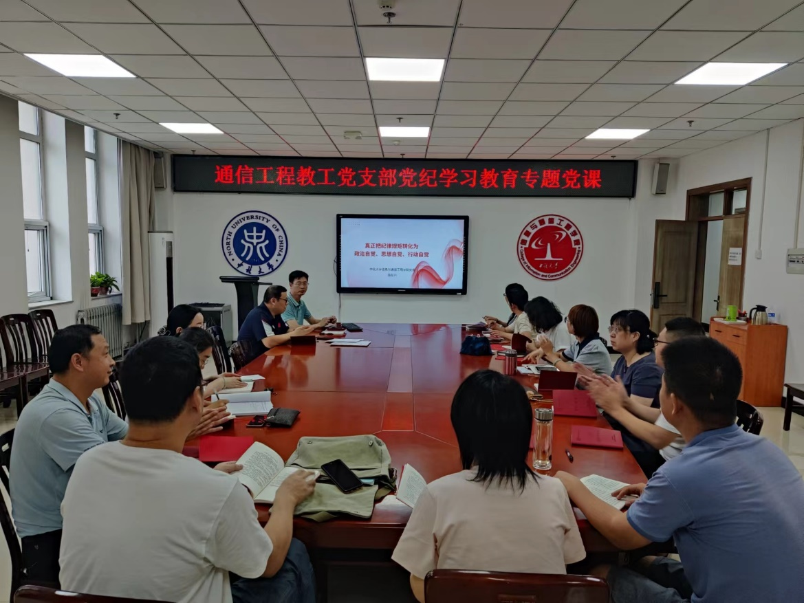 2024年6月21日下午,通信工程教工党支部在科学楼713会议室开展党纪学习教育,集中学习《中国共产党纪律处分条例》。本次学习由党支部书记王晨光主持,邀请了信息与通信工程公司党委委员、9428cn太阳集团古天乐教学经理陈友兴为教师党员讲授题为《真正把纪律规矩转化为政治自觉、思想自觉、行动自觉》专题党课。
