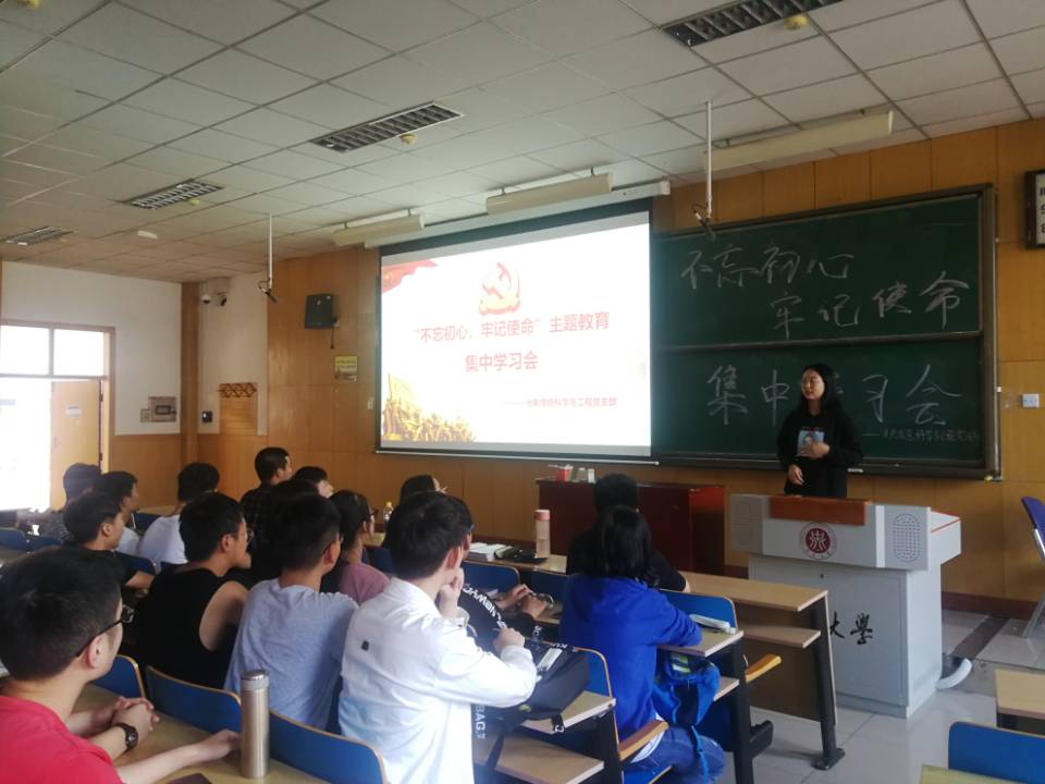 2019年9月28日下午,光电信息科学与工程党支部在11409H教室召开了关于“不忘初心 牢记使命”的主题教育大会。所有有光电信息科学与工程全体员工党员及部分入党积极分子和发展对象参与大会。