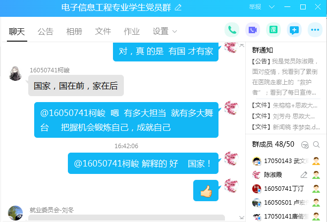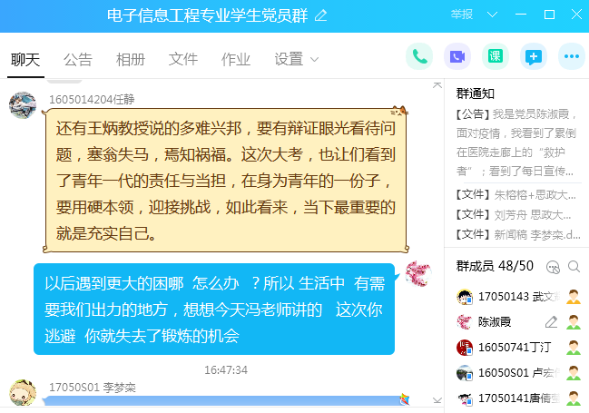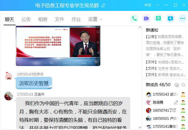 本次思政大课,是电子信息工程专业员工党支部第一次齐聚云课堂,共同学习思想政治理论知识。停课不停学,依靠高科技,通过云课堂,我们依然可以做到思想火花的碰撞,党员同志们更加坚定了理想信念,大家纷纷表示要从自身出发,把理论运用到实践中,积极支持防疫斗争,做到“心有大我、胸有大志、肩有大任、行有大德”,谱写自己的“大写青春”。