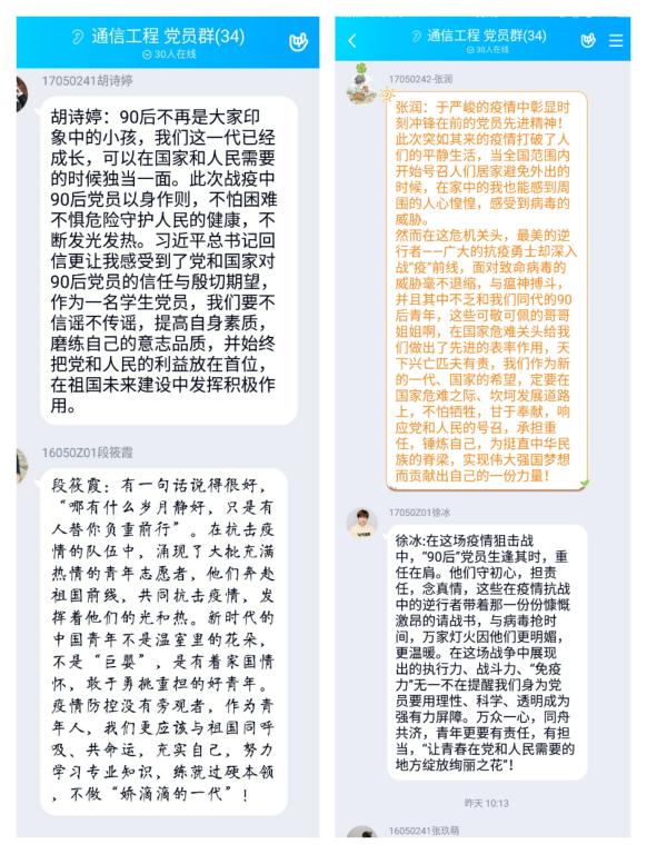 支部风采 您现在正在浏览: 首页 >> 支部风采 >> 正文 学习精神榜样,彰显青春力量——通信工程员工党支部学习总书记回信 发布时间: 2020-03-23 作者: 浏览次数: 习总书记的回信让我们深思,点赞90后,表达着对我们青年一代的肯定与赞扬。3月18日,通信工程员工党支部全体党员共同在网上学习了《总书记回信点赞90后党员,青年反响热烈》、《习近平总书记的回信在北京大学援鄂医疗队全体“90后”党员中引起强烈反响》两篇文章。 同时同志们积极地在群内分享感想,进行讨论,他们都感慨万分,表达了对抗疫一线同志的崇高敬意,同时也表示了要不负习总书记的殷切希望,不畏艰险,从小事做起点滴做起,加强学习,时刻牢记自己的初心,走出属于青年一代的责任与担当,彰显90后的青春力量。 上一篇:从“抗疫”中感悟爱国情怀—— 光电信息科学与工程专业员工党支部开展党日活动 下一篇: 员工党员学习习近平总书记给北京大学援鄂医疗队全体“90后”党员的回信精神