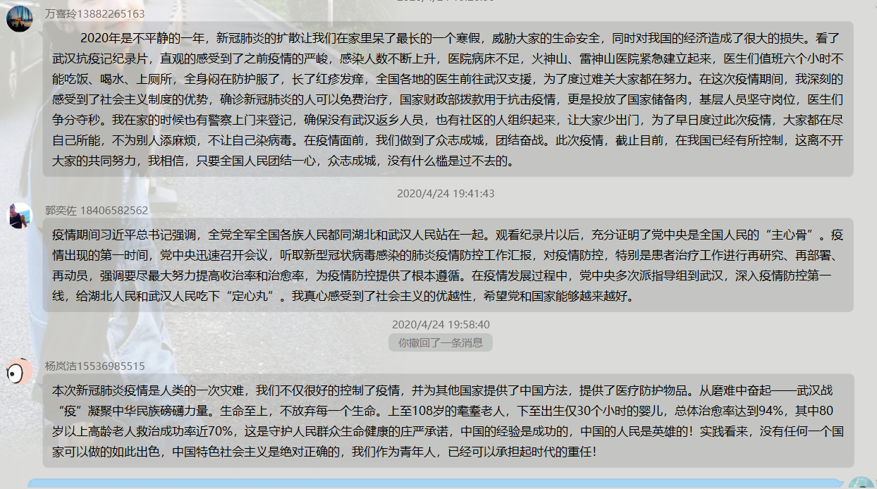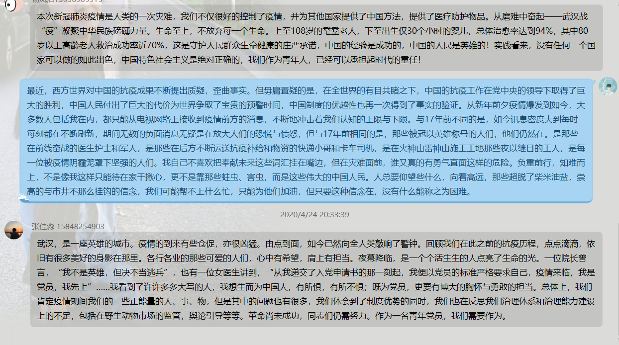 作为信息对抗技术专业员工党支部中的一员,我们虽然可能大多身处于疫情防控的大后方,但并没有忘记身为一名共产党员的义务与责任,保持思想警惕,理性思考,增强“四个意识”、坚定“四个自信”、做到“两个维护”。对此特殊的国际环境,信抗支部的成员们结合纪录片中所讲述的内容,以及疫情期间看到的、听到的人和事,分享了自己的切实感受,讲述出了自己的抗疫故事。大家在分享中互相学习理论知识,吸收先进思想,争做日日有进步的先进党员。