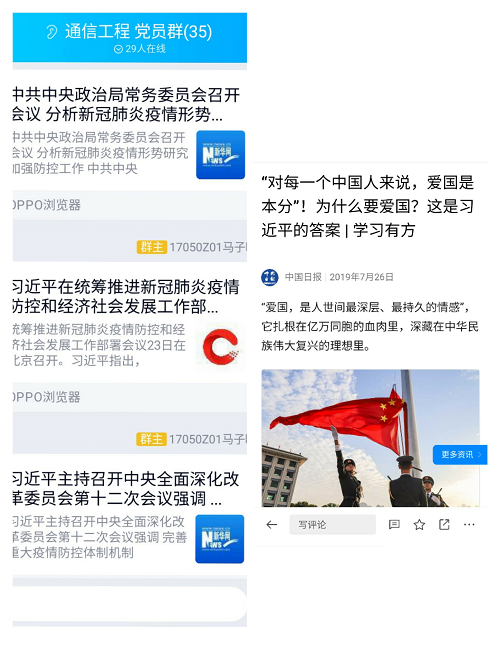 集中学习:抗疫不停学、充电不止步,我们支部同志共同学习了《为什么要爱国?这是习近平的答案》等文章,我们是祖国的花朵,爱国将扎根在我们亿万同胞的血肉里。通过集中学习文章,了解对于新冠肺炎的各项工作动态,正确认识新冠肺炎,共战疫,我们共胜利。