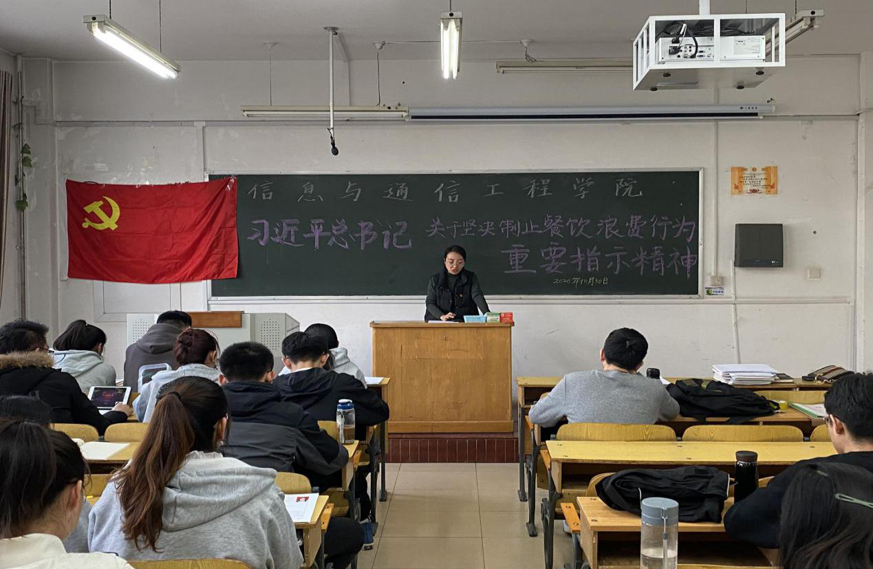为切实抓好党员日常理论学习,进一步提高学习的针对性和实效性,2020年10月30日下午,通信工程专业员工党支部的党员们在支部书记闫婷老师的带领下,一同学习了习近平总书记关于坚决制止餐饮浪费行为的重要指示精神。