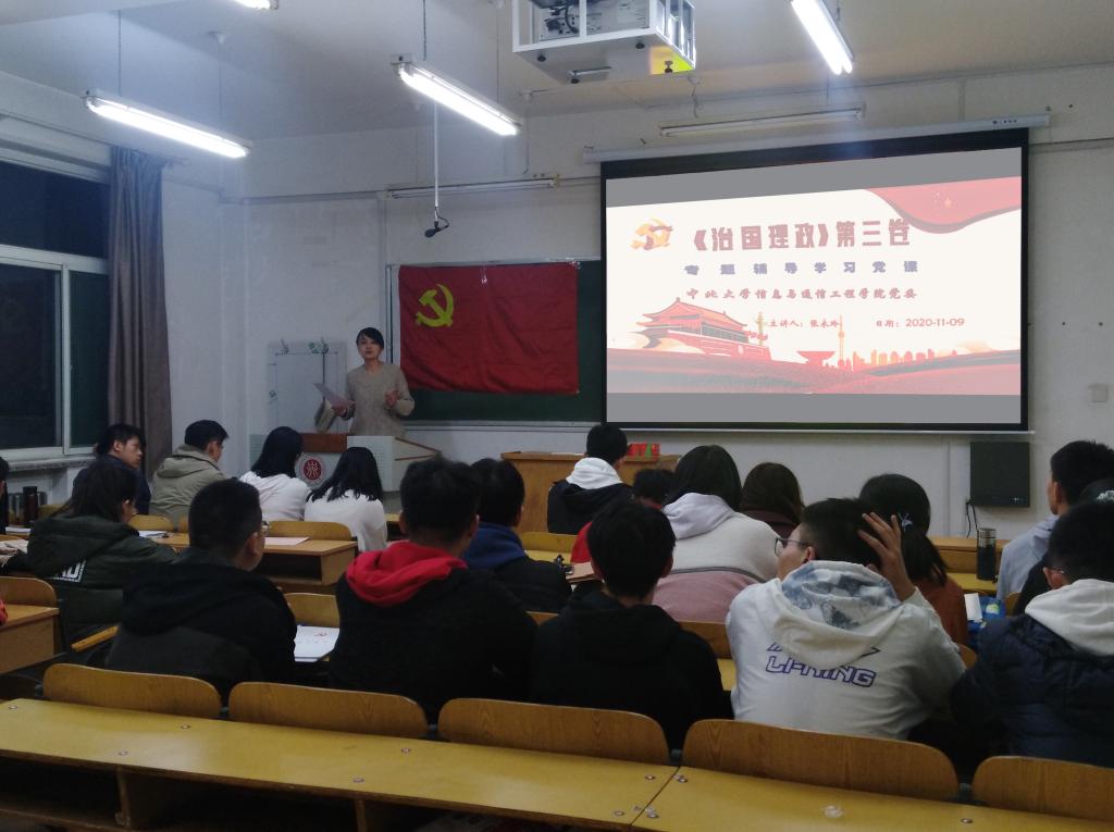 2020年11月9日晚7点,光电信息科学与工程专业员工党支部书记张永玲老师为支部全体员工党员开展了《习近平谈治国理政》第三卷专题辅导学习党课,并重点讲述了其中第一个专题——谱写新时代中国特色社会主义新篇章。