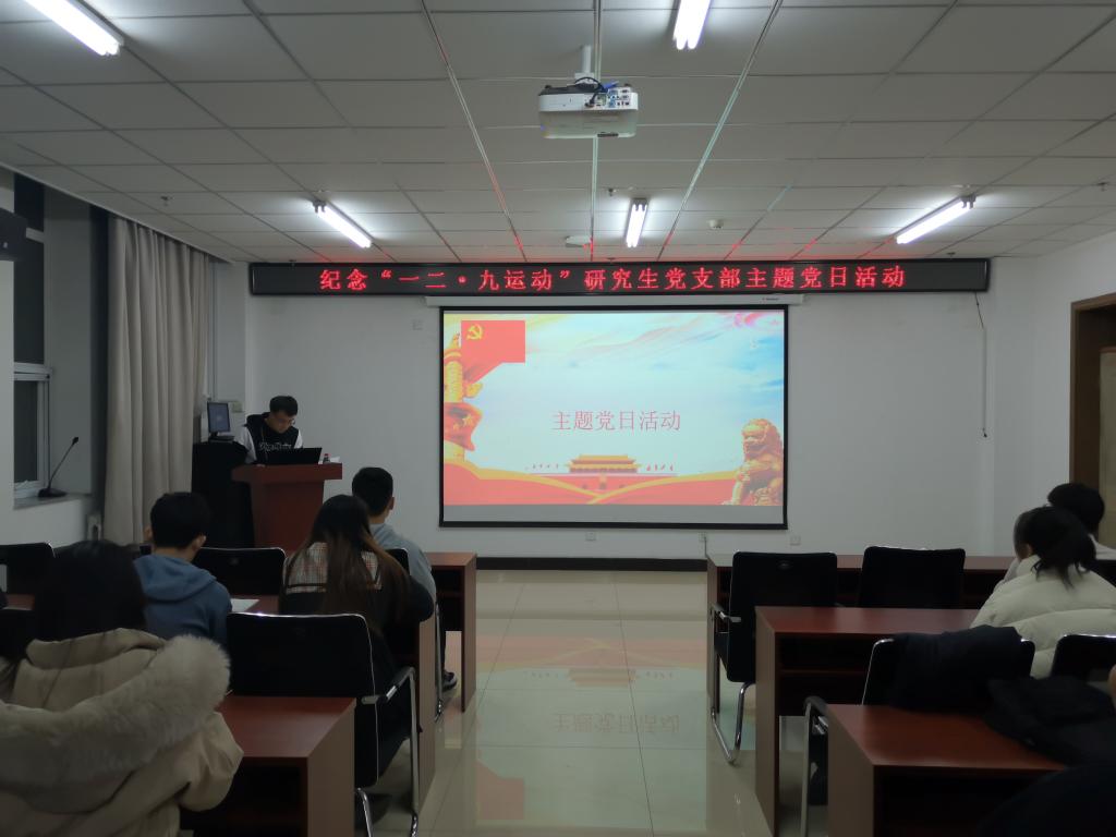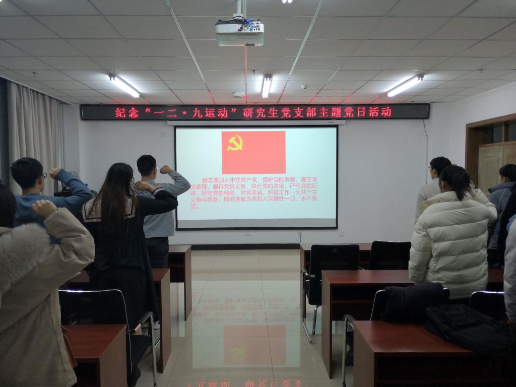 12月7日晚上7点半,研究生第一、二党支部于科学楼715会议室开展纪念“一二·九运动”主题党日活动。首先,韩雨同志带领大家重温了入党誓词。随后各支部有序上缴了党费,并且观看了电影《十面攻敌》。通过重温那段令人热血沸腾的历史,激发了大家的爱国热情,弘扬了爱国主义、集体主义的光荣传统,更激励了大家强烈的社会责任感和历史使命感,从而努力锻炼和打造自己,为中华民族的复兴作出贡献。最后,支部副书记薛凯亮对此次党日活动进行了总结。