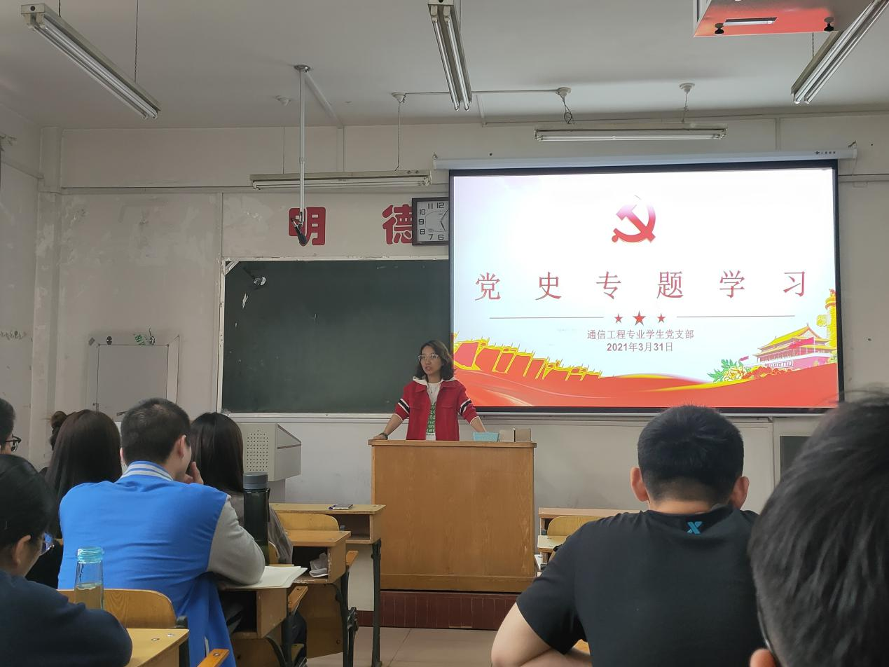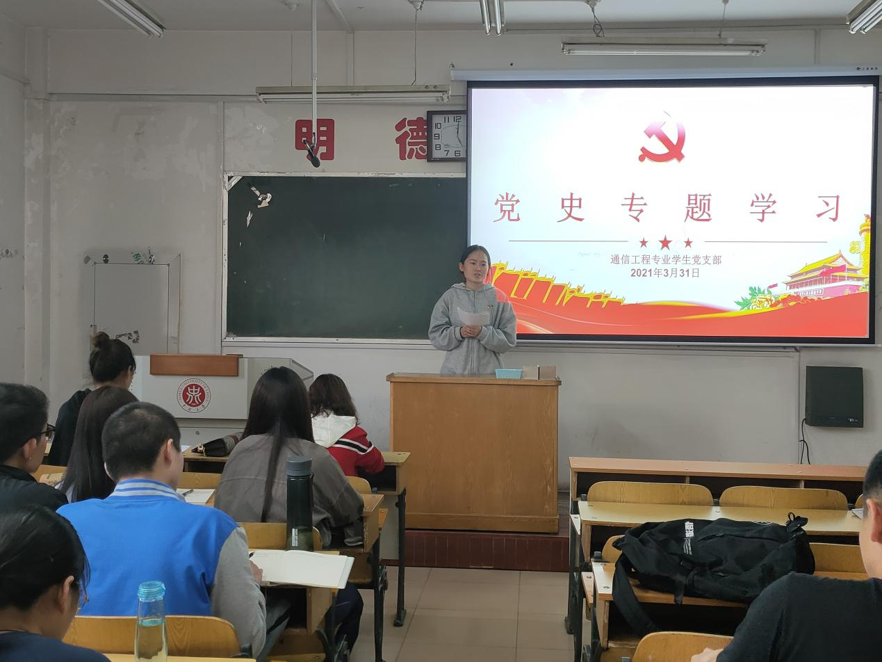 为切实抓好党员日常理论学习,响应中央党史学习领导小组《党史学习教育实施工作方案》以及省委《关于开展党史学习教育的实施方案》,2021年3月31日下午,通信工程员工党支部在闫婷同志的带领下,进行了党史专题学习。