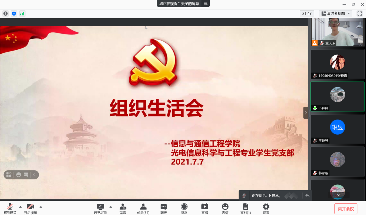2021年7月7日,在中国共产党成立一百周年这个特殊的节点,为了进一步加强员工党员思想建设,规范党员言行,提高党员素质,增强党性,光电信息科学与工程专业员工党支部召开组织生活会,借助腾讯会议线上开展。