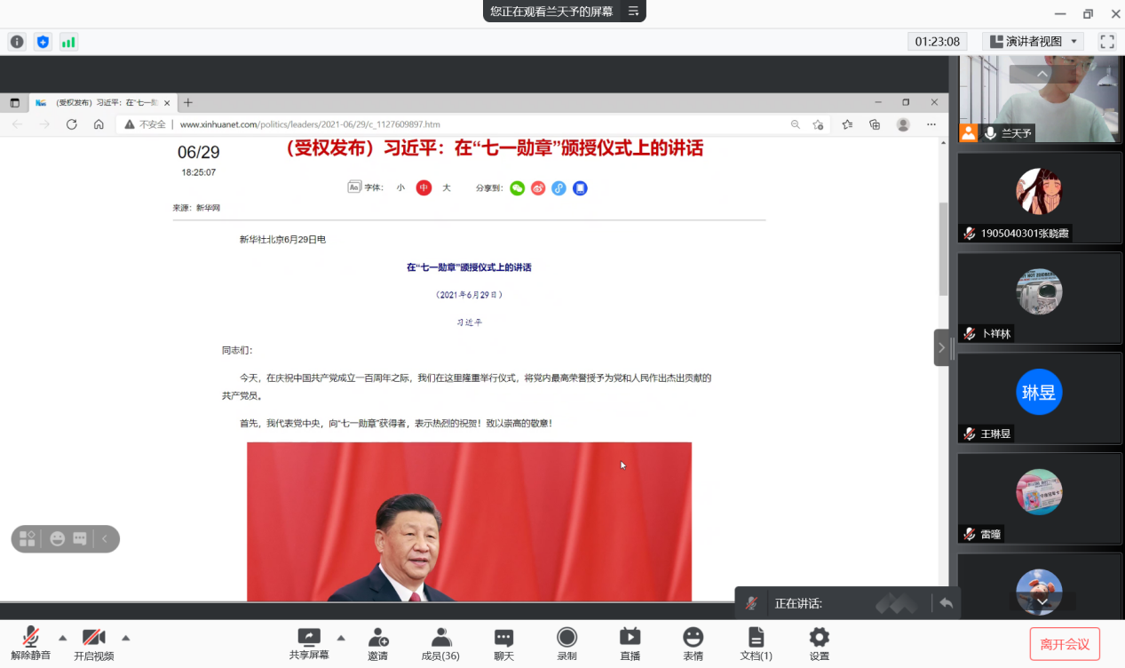 二是学习习近平总书记在“七一勋章”颁授仪式上的讲话精神,并重点学习王红旭同志的光荣事迹。全心全意为人民服务,是我们党的根本宗旨,是一代又一代中国共产党人的不懈追求。在“七一勋章”颁授仪式上,习近平总书记强调:“江山就是人民,人民就是江山。”我们新时代员工党员要谨记总书记教导,以王红旭同志等为榜样,坚定理想信念,立志为祖国和人民贡献力量,创造无愧于时代的一流业绩。