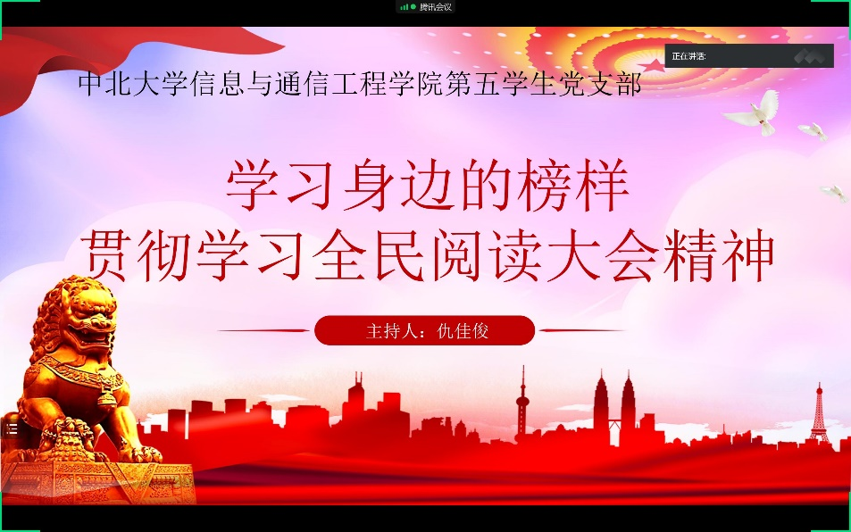 为了学习身边的榜样暨贯彻学习全民阅读大会精神,第五员工党支部于六月十二日以线上会议的形式举办了本次活动。活动召开人仇佳俊同志,参会人第五员工党支部全体党员。