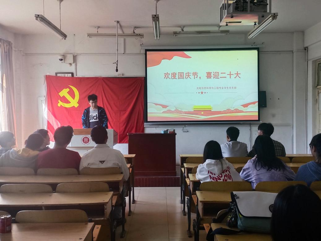 为庆祝新中国成立73周年,迎接党的二十大胜利召开,光电信息科学与工程专业员工党支部于9月25日在10307H开展以“欢度国庆节,喜迎二十大”为主题的党日活动。