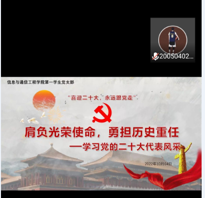 如果信仰有红色,那一定是中国红。中国共产党第二十次全国代表大会将于10月16日在北京召开。为迎接即将召开的党的二十大,2022年10月5日晚7点,电子信息工程专业员工党支部组织党员、发展对象、积极分子集中观看了“二十大代表”风采视频,学习榜样精神。